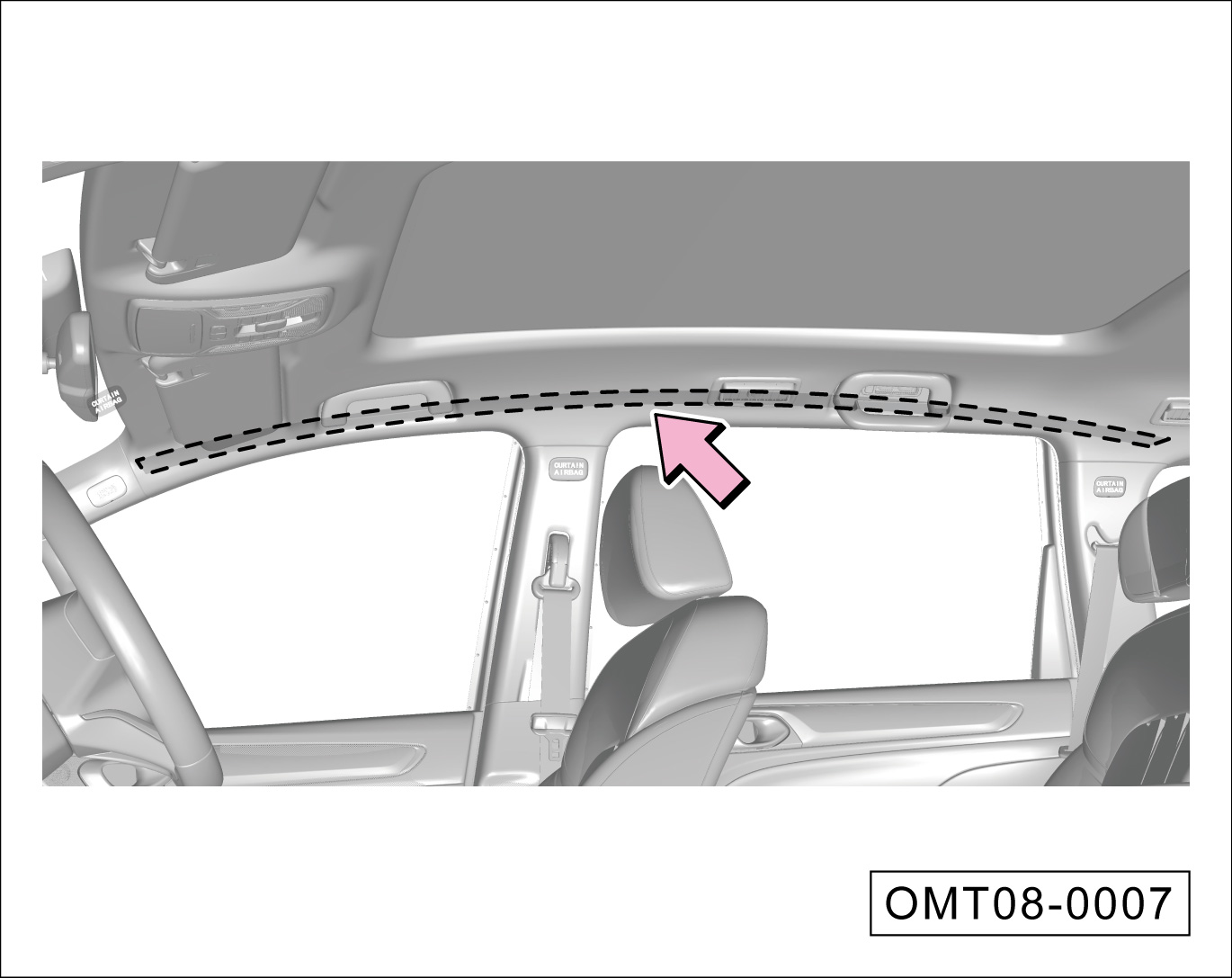 侧窗帘式安全气囊安装在顶棚左、右两侧内部(虚线阴影部分),顶棚两侧饰板上标有“CURTAIN AIRBAG”标志。