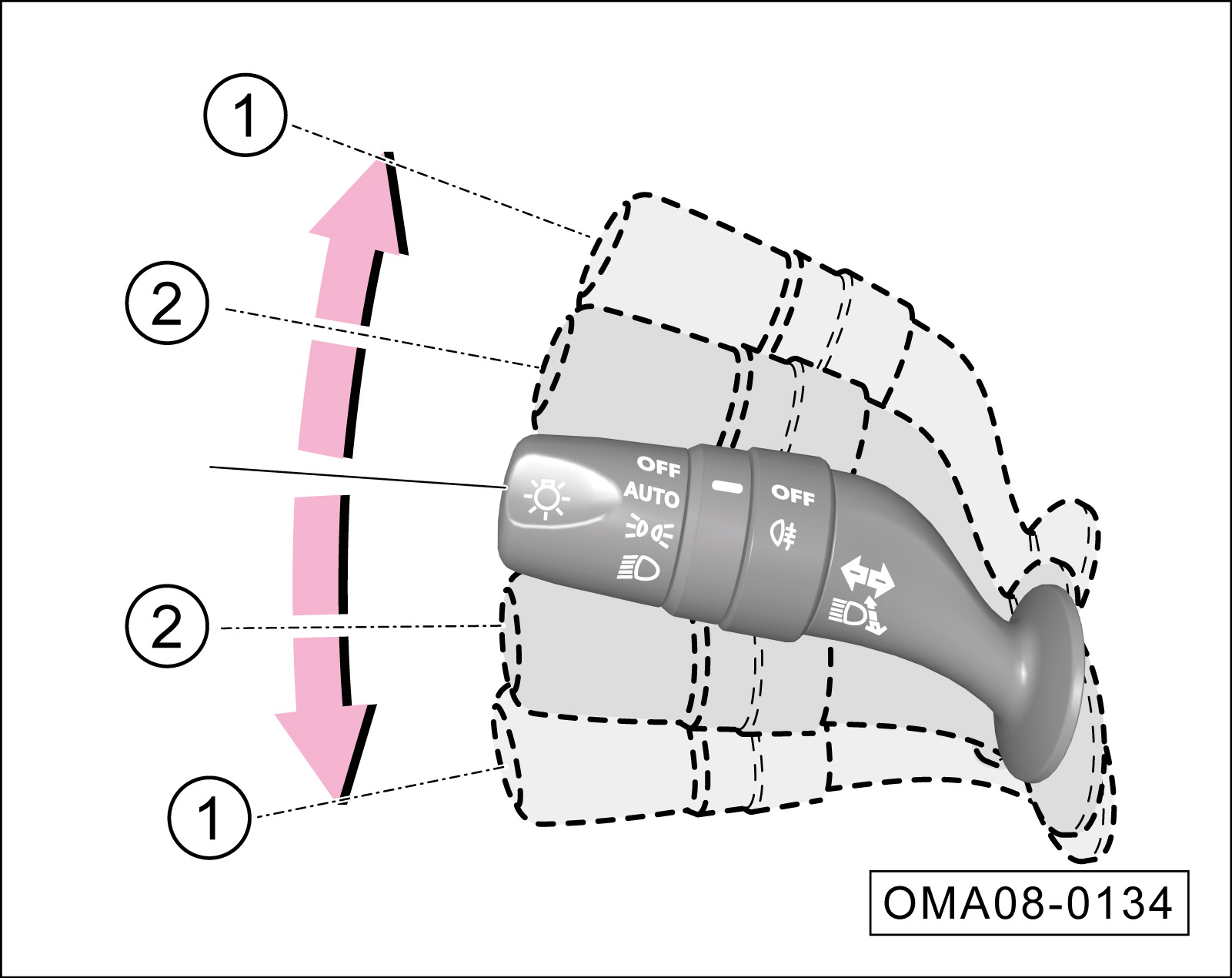 启动开关在“ON”挡位时,旋转车灯开关①可控制开启或关闭AUTO(自动灯光)、
