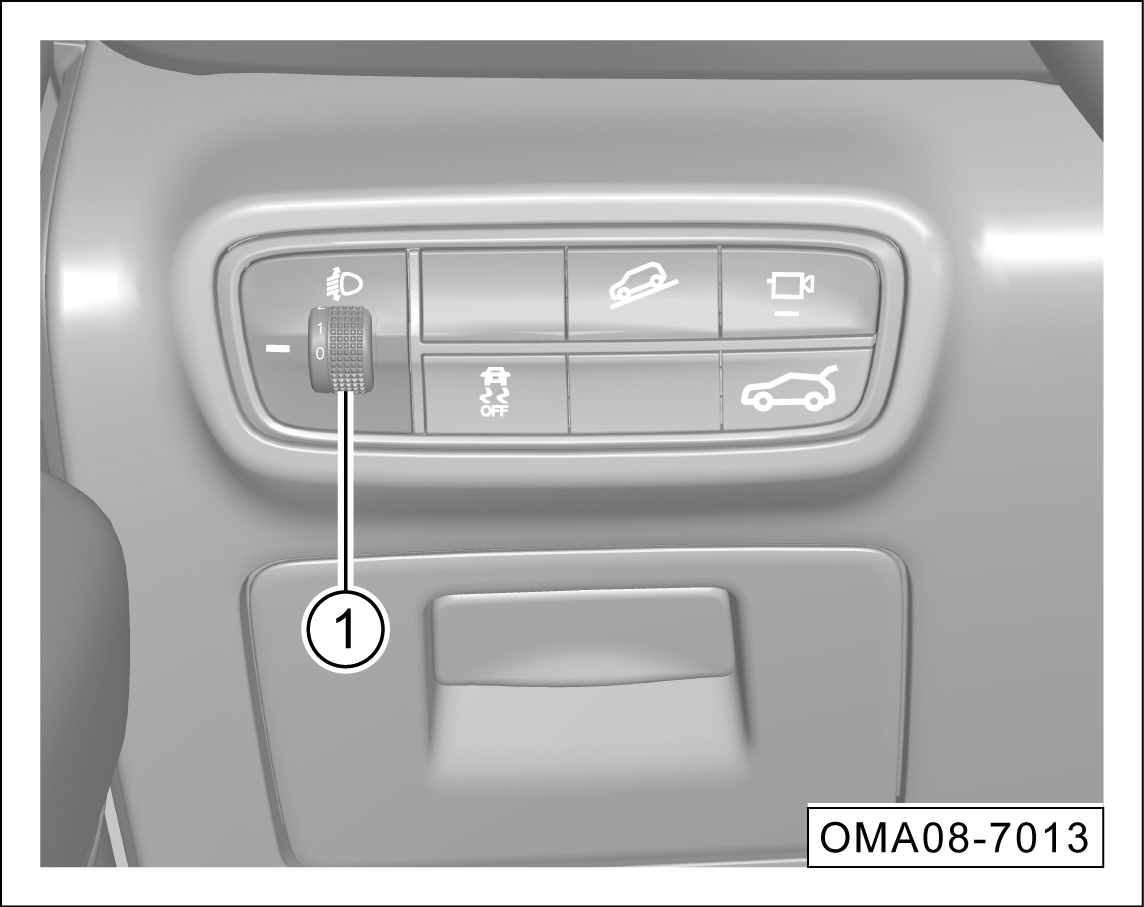 旋转旋钮①手动调节前大灯(近光灯)照程,调节挡位有“0、1、2、3”挡。灯光的高度会随着调整数值的增大而变低。