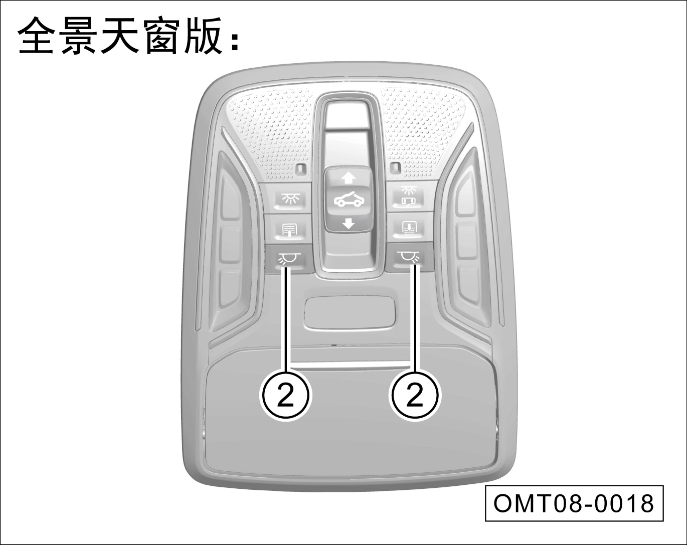 第二/第三排车顶照明灯熄灭时,按一下开关①,对应侧的照明灯点亮;再按开关①,对应侧的照明灯熄灭。