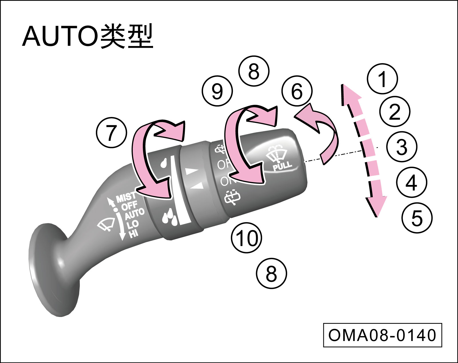 启动开关在“ON”挡时,可操作刮水器组合开关:
