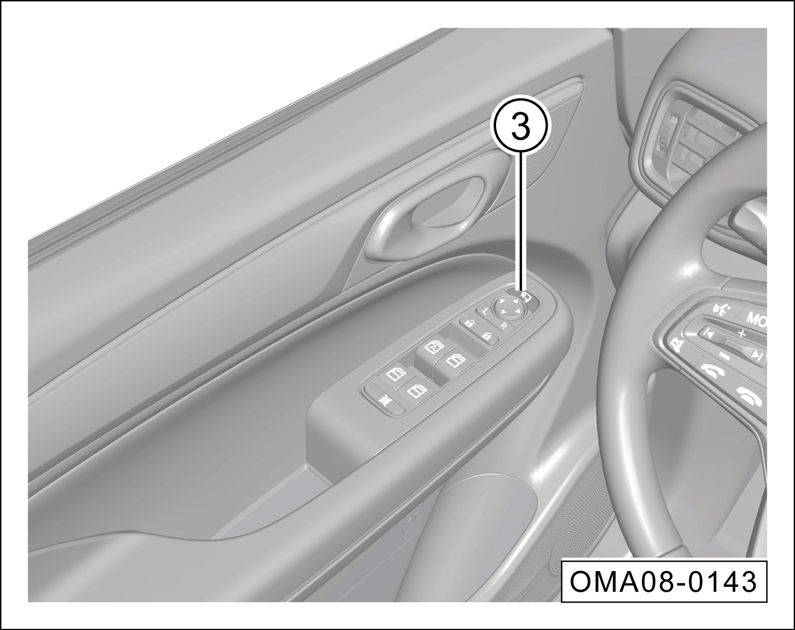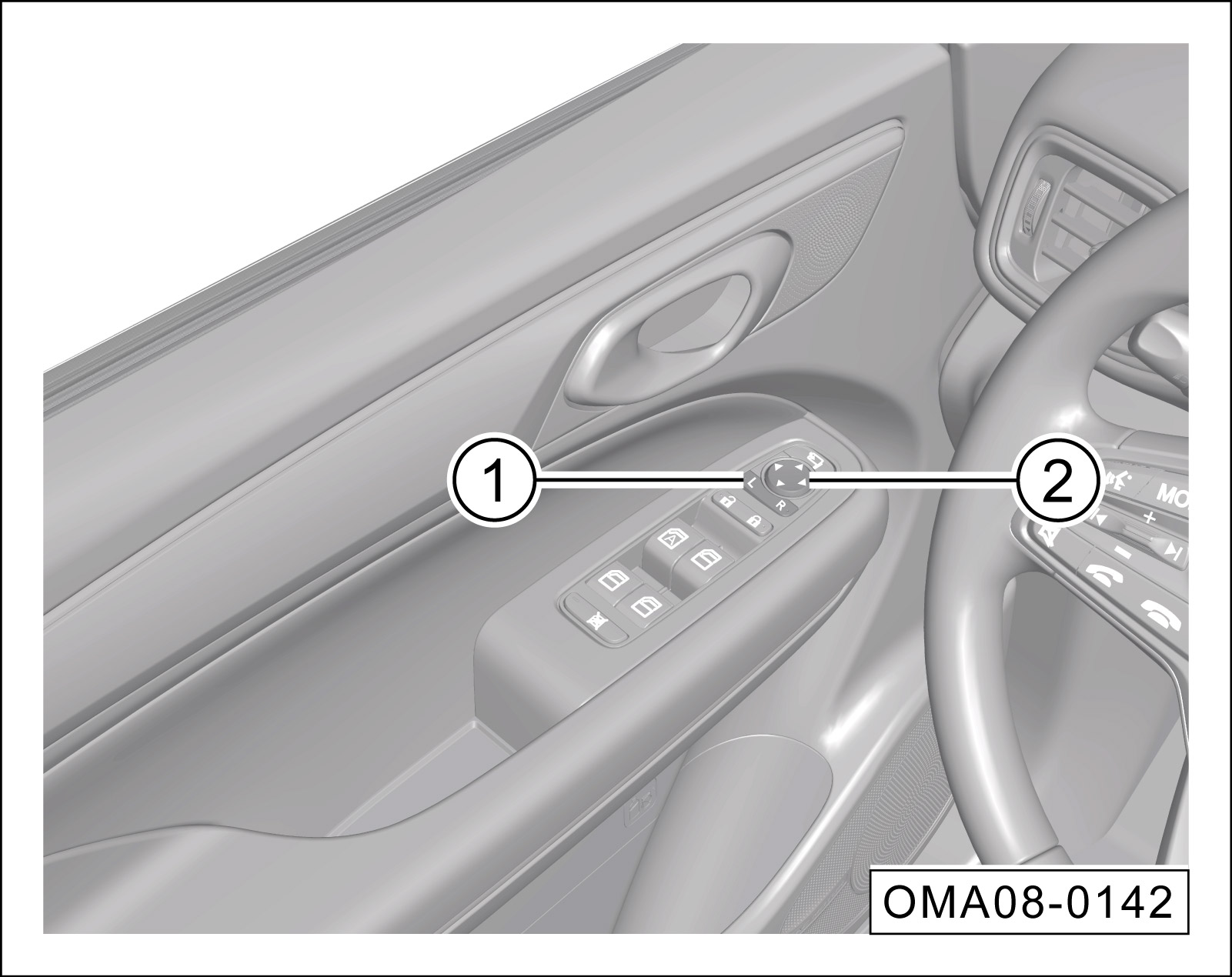 按选择键①的“L”端或“R”端,选择左侧或右侧外后视镜。