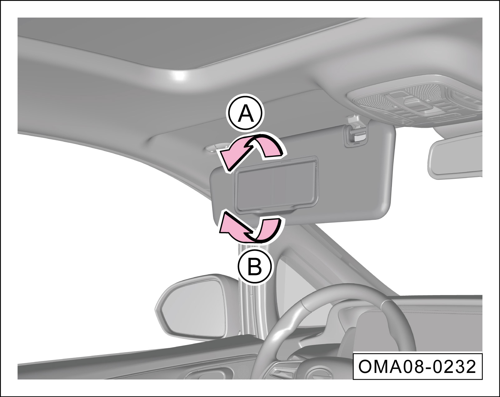 如需使用梳妆镜,下翻遮阳板后,沿-箭头B-方向掀开梳妆镜盖板即可,同时梳妆镜照明灯*自动点亮。