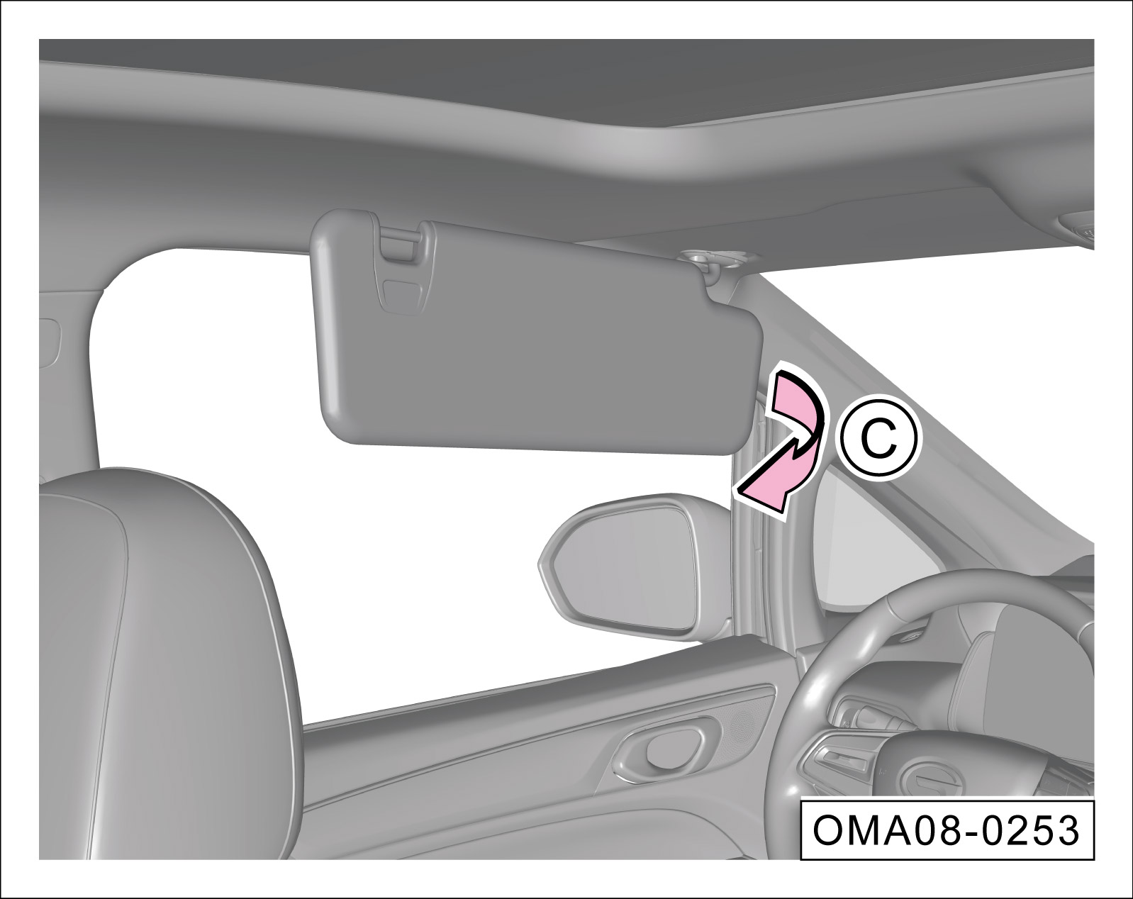 下翻驾驶员侧或前排乘员侧的遮阳板后,沿-箭头C-方向从一侧固定支架拉出,可遮挡从侧车窗射入的阳光。