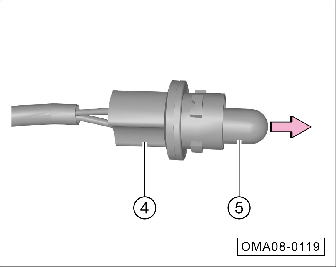 沿-箭头-方向从牌照灯灯泡插座④上拔出牌照灯灯泡⑤。