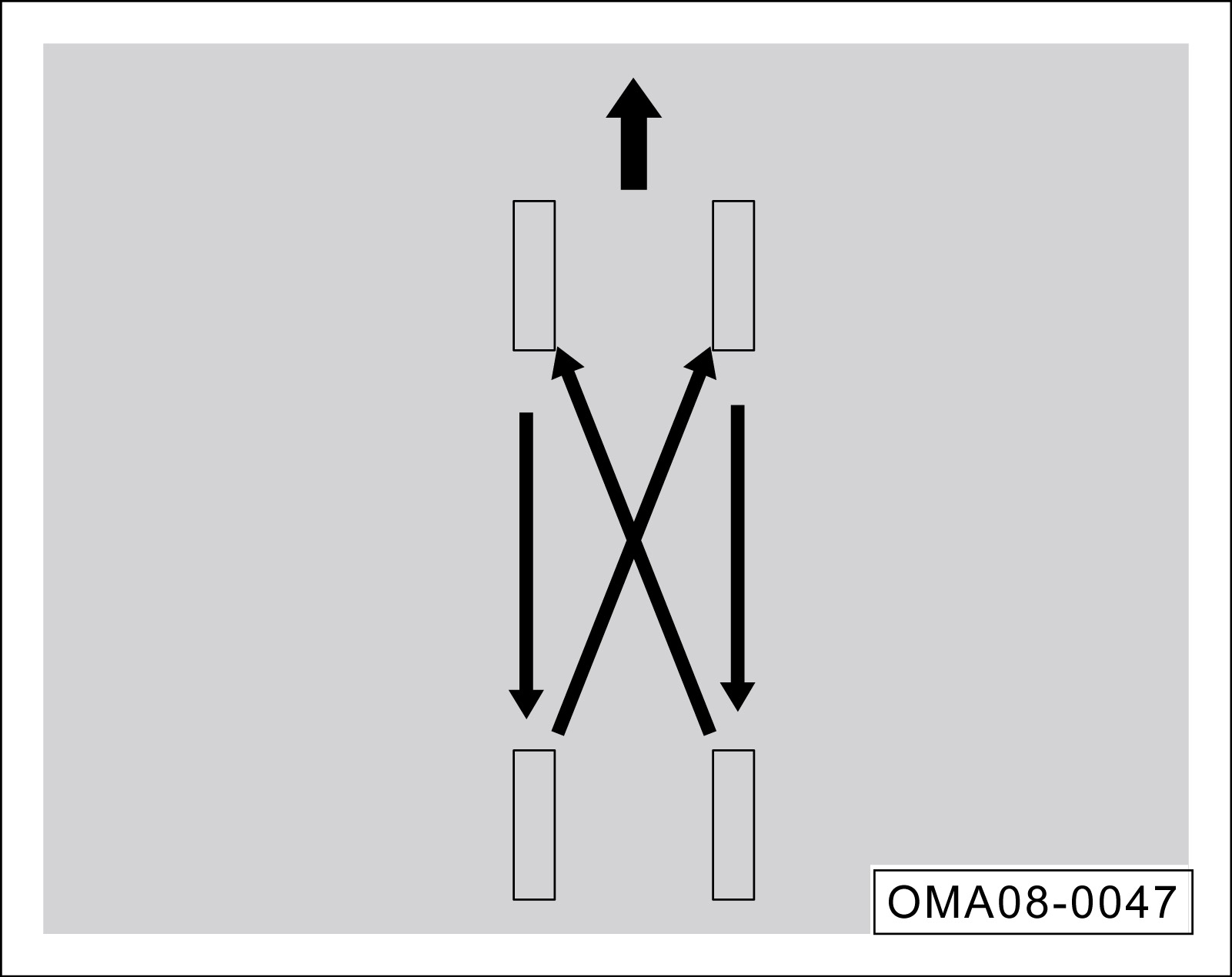 如前轮轮胎的磨损比后轮严重,建议如图所示将前后轮换位安装,从而使所有轮胎的使用寿命大致相同。