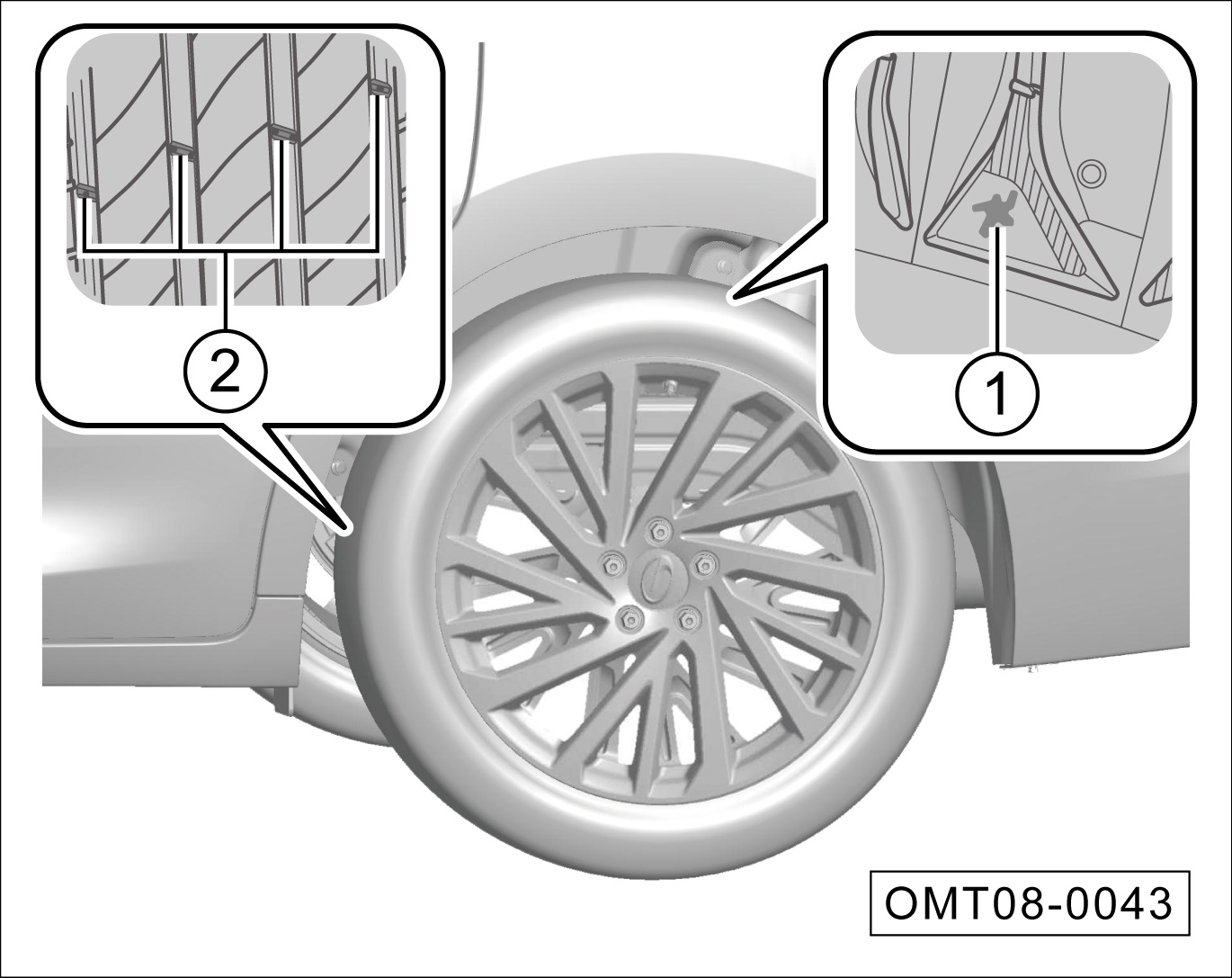 图案①用于指示轮胎外圆花纹磨损的情况,如果轮胎外圆花纹磨损到图案,此轮胎已不能安全使用,必须立即更换。