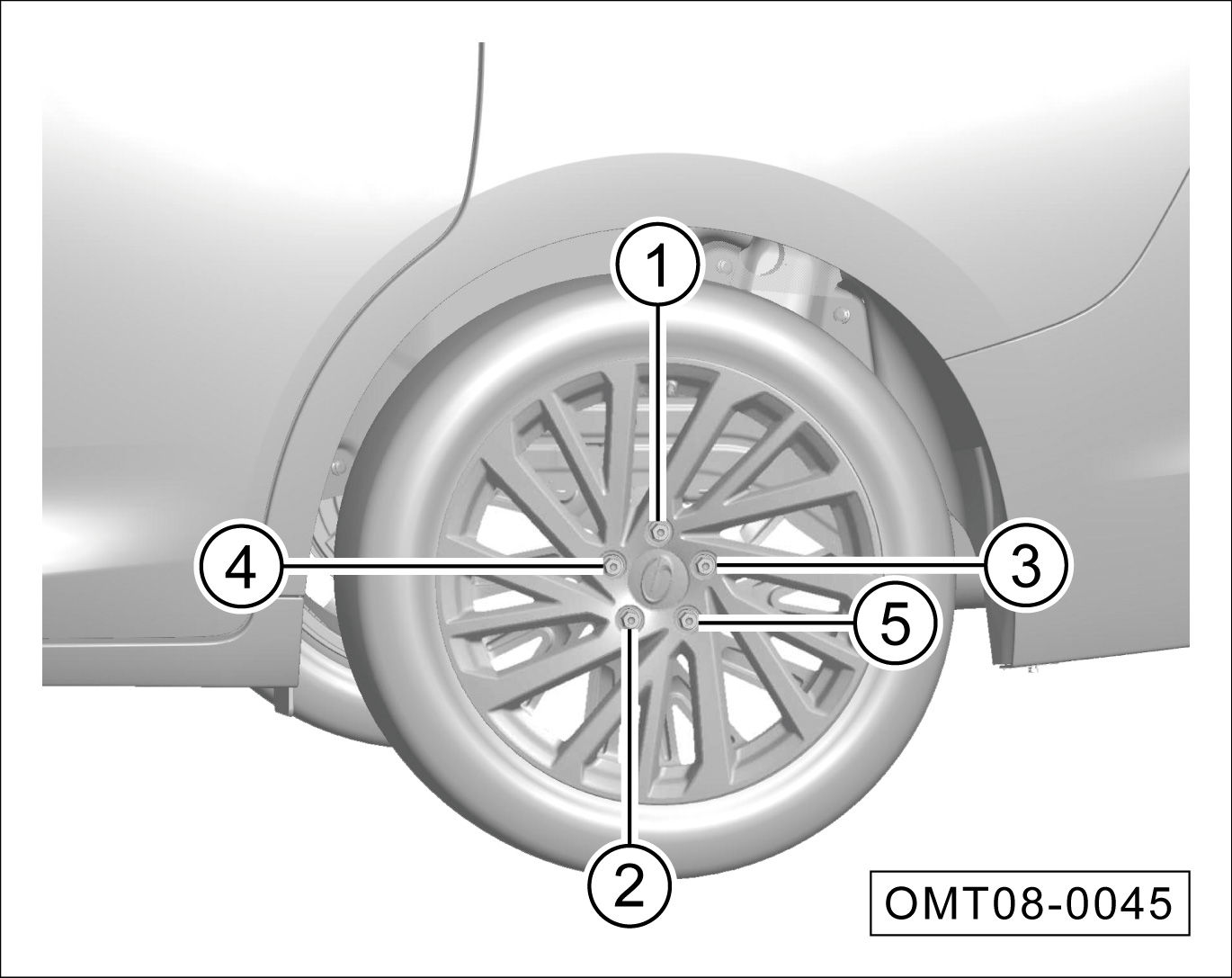 安装车轮螺栓,并按图中①~⑤顺序用车轮螺栓拆卸扳手预紧。
