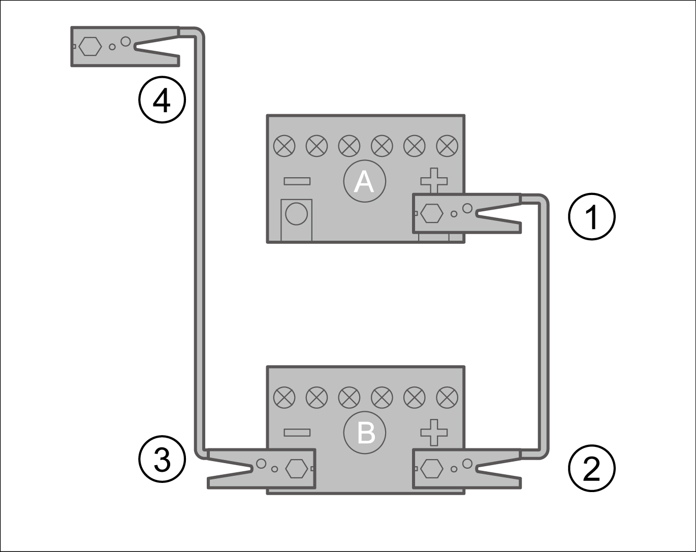 将红色电缆的①端连接到缺电蓄电池“A”的正极(+)上,另一端②连接到供电蓄电池“B”的正极(+)上。