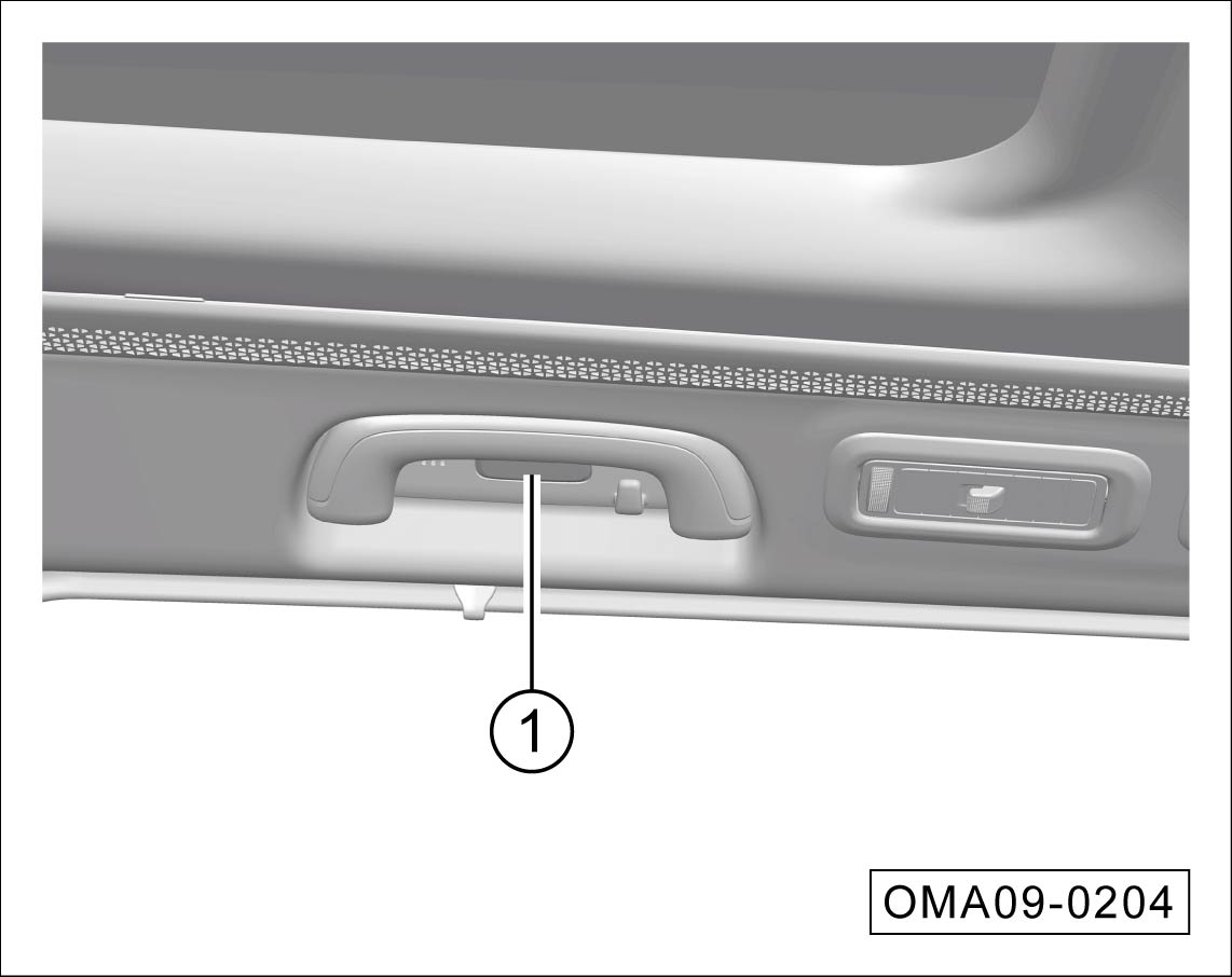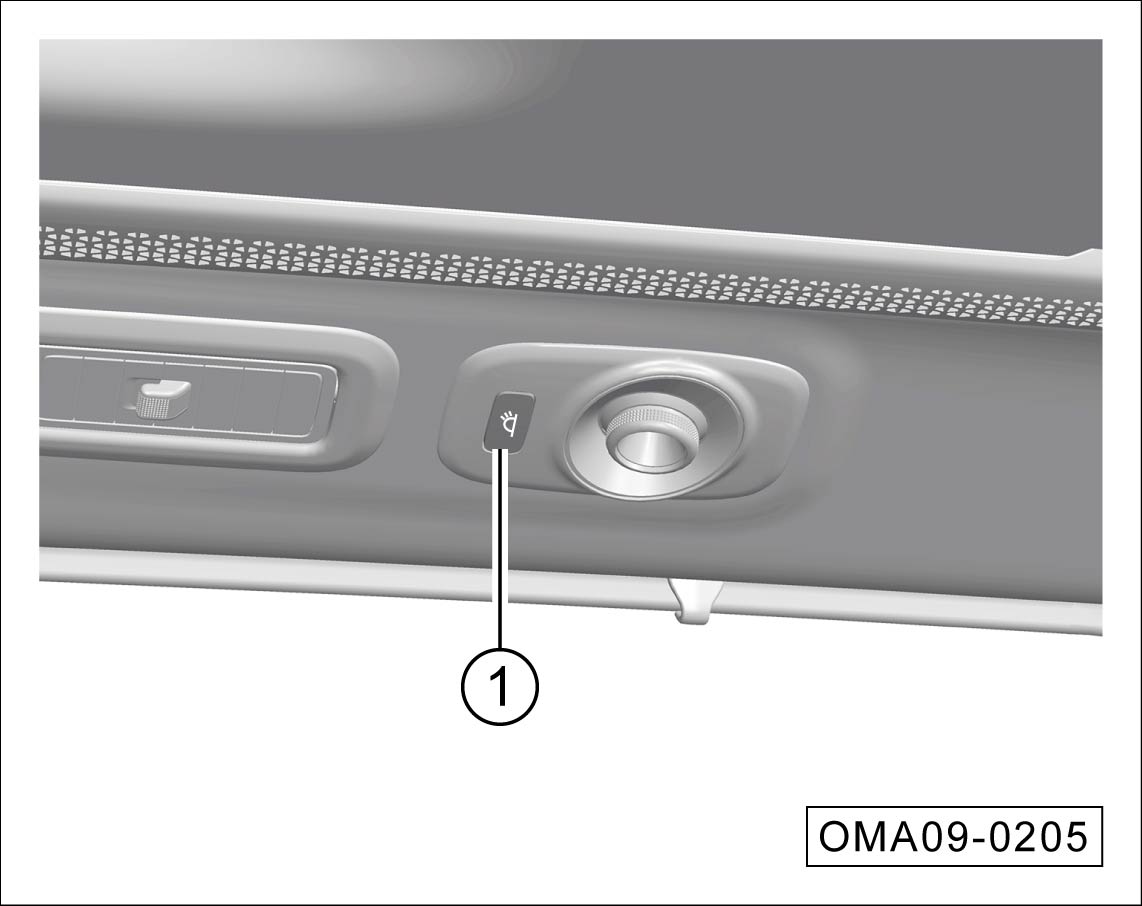 第二排/第三排车顶照明灯熄灭时,按一下开关①,对应侧的照明灯点亮;再次按开关①,对应侧的照明灯熄灭。