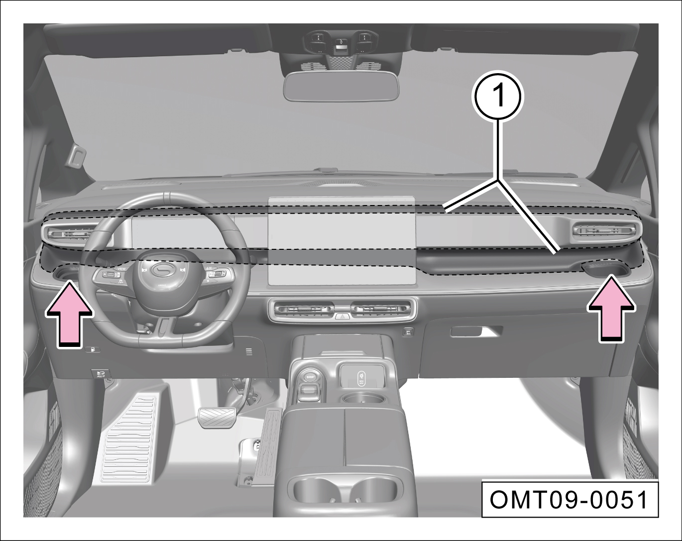 仪表台部分区域为软质材料,请不要把尖锐物体放置于①处,以防表面划伤。