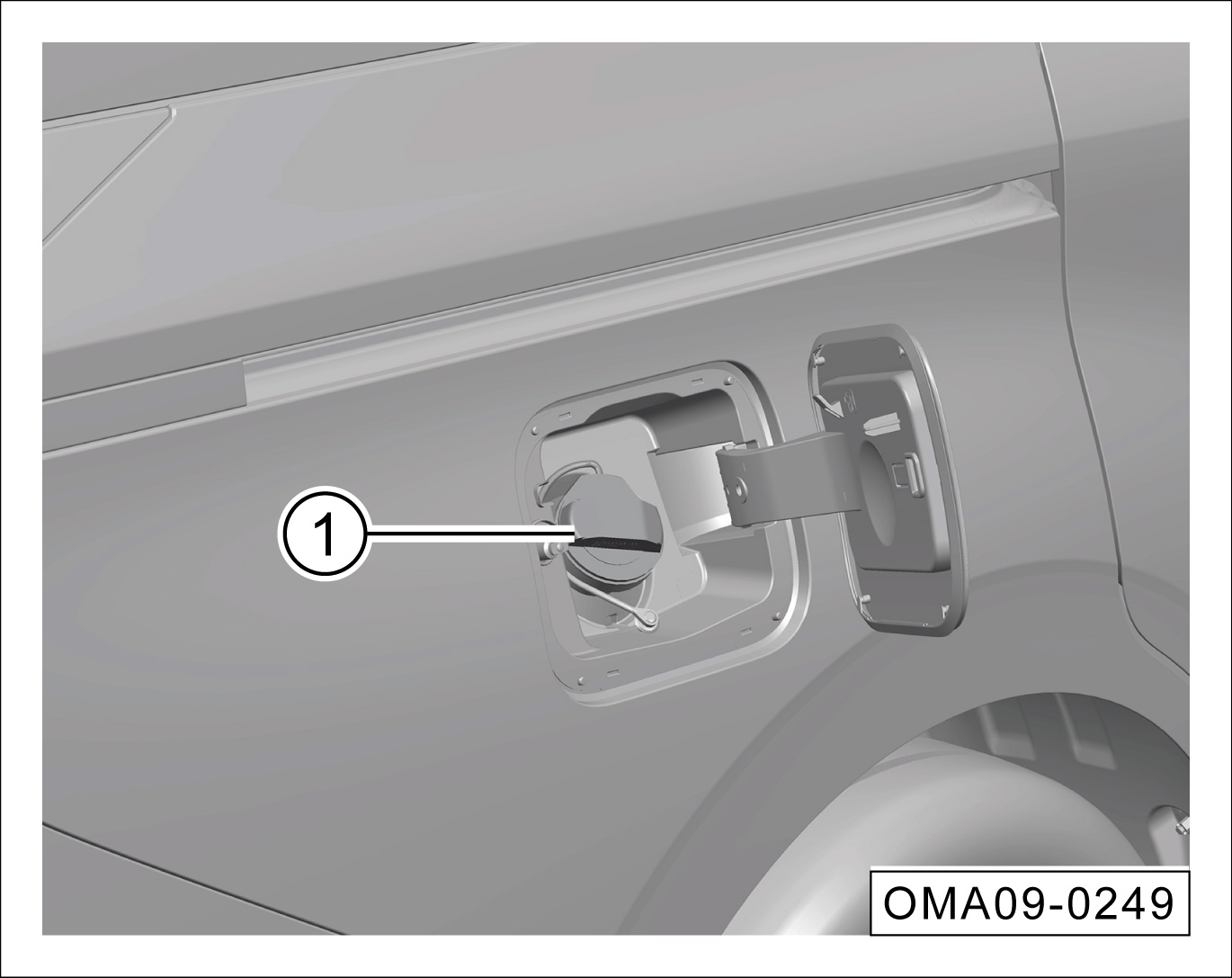 按压加油口盖板左侧,加油口盖板自动弹开。逆时针缓慢旋出加油口盖①,完全拧出加油口盖①前,需将加油口盖①停留在原位片刻,使燃油箱释放内部的燃油蒸汽压力,然后取出加油口盖①。