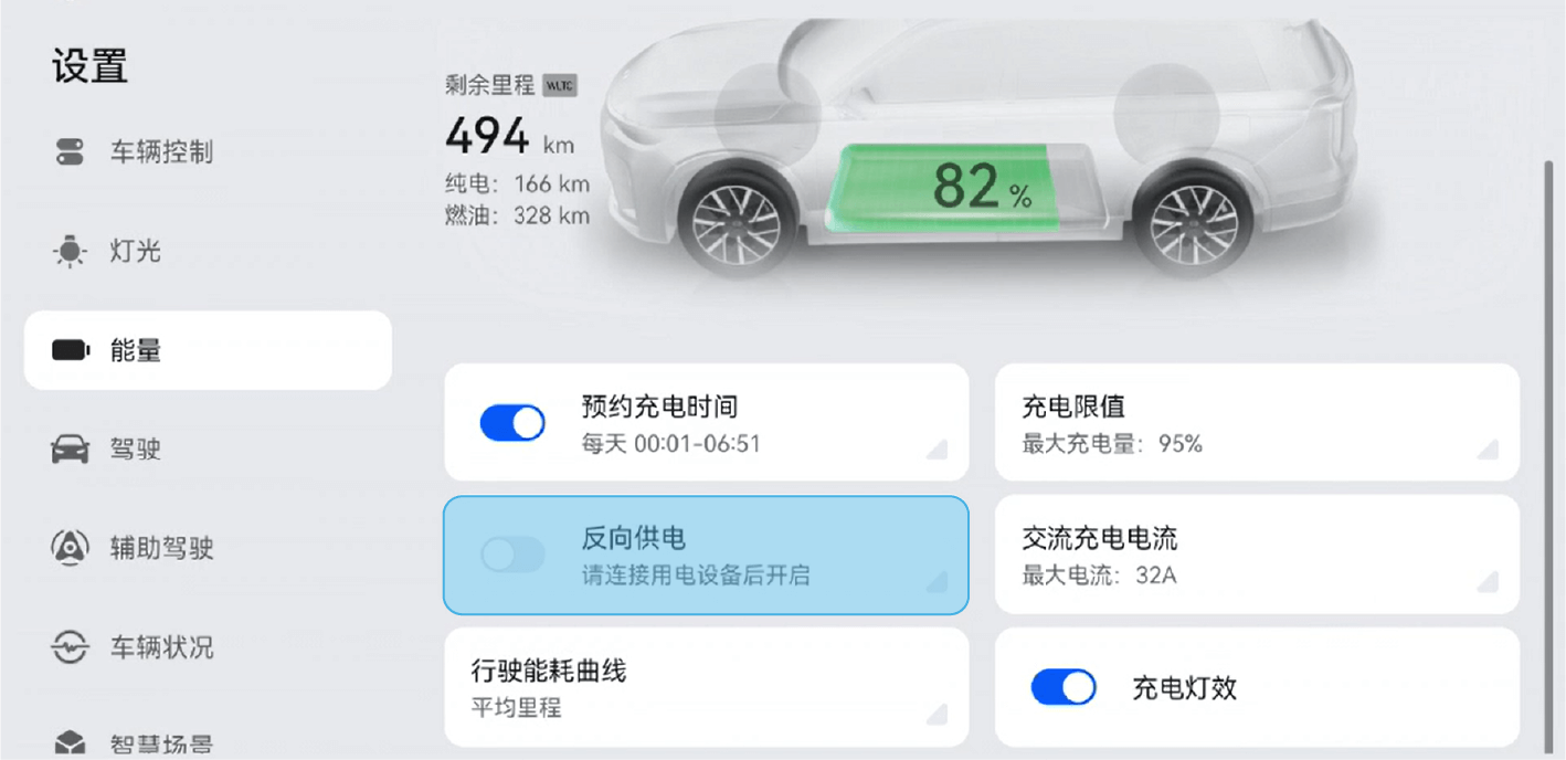 使用完成后,在中控屏进入“设置>能量”,关闭反向供电,车辆结束充电。