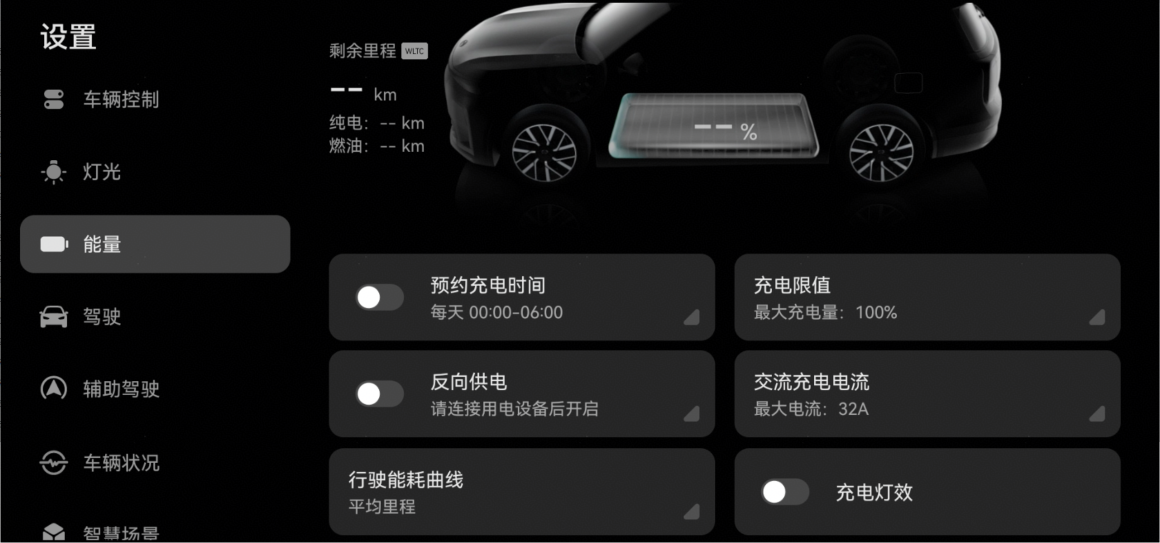 您可以在中控屏点触“设置 > 能量”,进入能量管理界面。