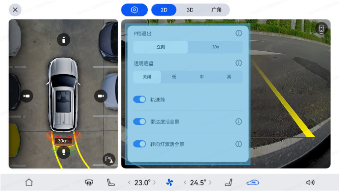 开启时:从R挡切换到P挡后,全景影像界面保持30秒后,再恢复到进入倒车影像前的界面,此时有退出按钮。可以通过点击退出按钮,主动退出全景影像界面;若不点击,则30秒后自动退出全景影像界面。 关闭时:从R挡切换到P挡后,立即退出全景影像界面,恢复到进入全景影像前的界面。默认P挡立刻退出。 |