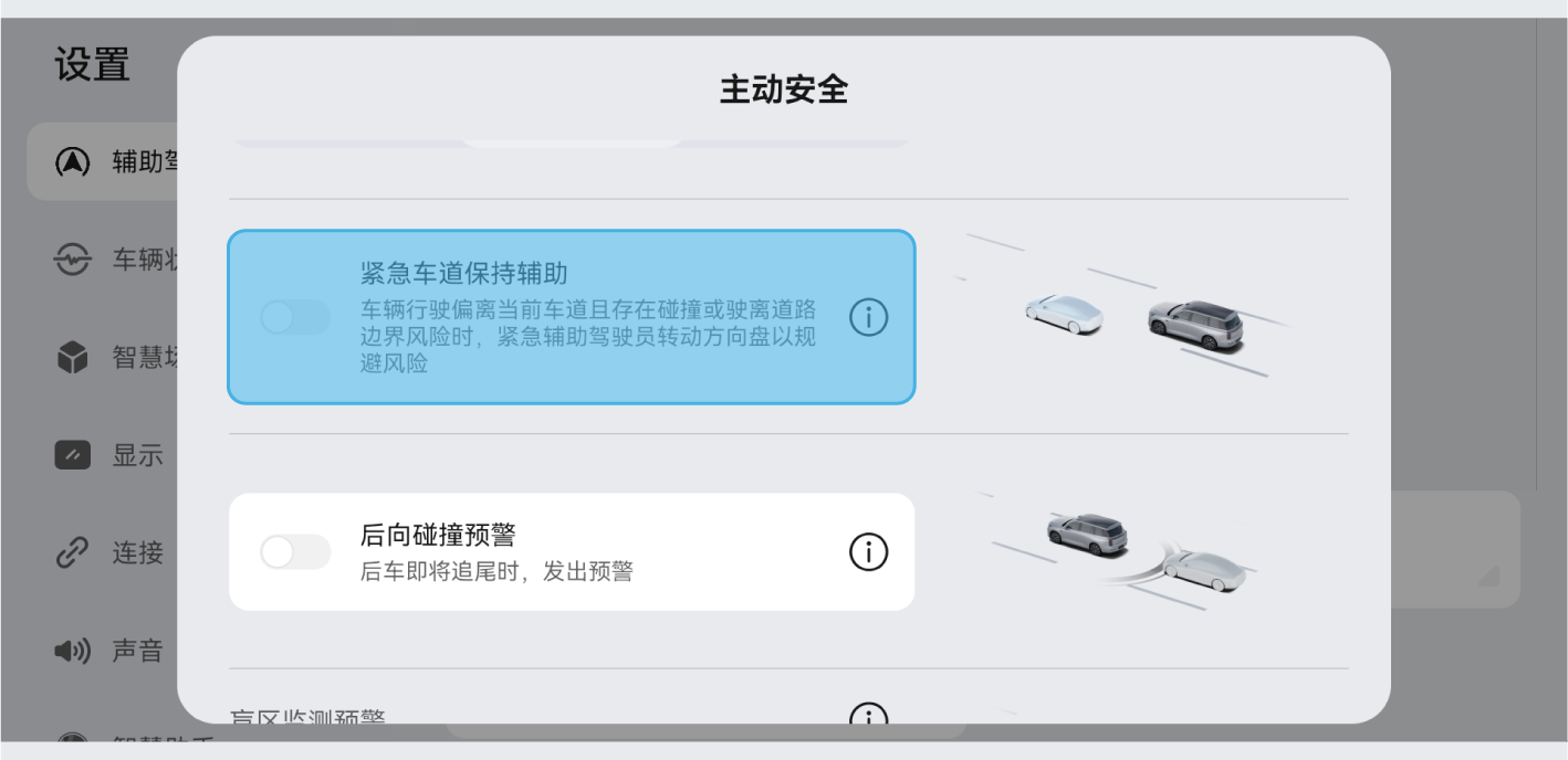 在中控屏进入“设置>辅助驾驶>主动安全>紧急车道保持”,设置开启或关闭紧急车道保持辅助系统。
