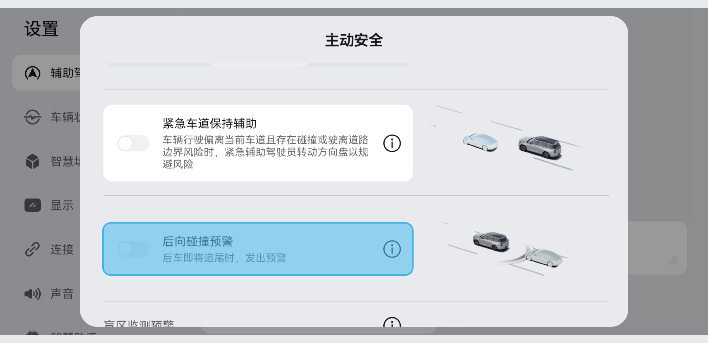 在中控屏进入“设置>辅助驾驶>主动安全>后向碰撞预警”,设置开启或关闭后向碰撞预警系统。