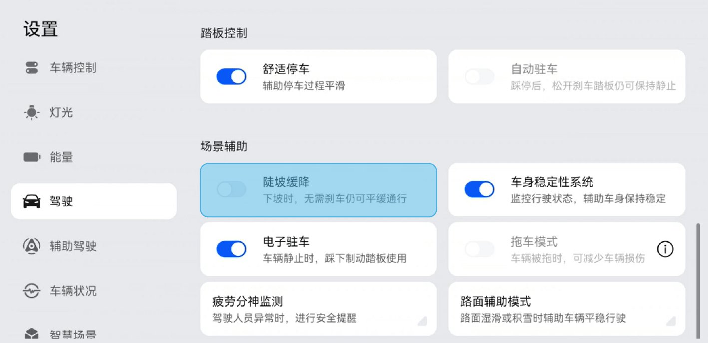 在中控屏进入“设置>驾驶”,开启或关闭陡坡缓降。