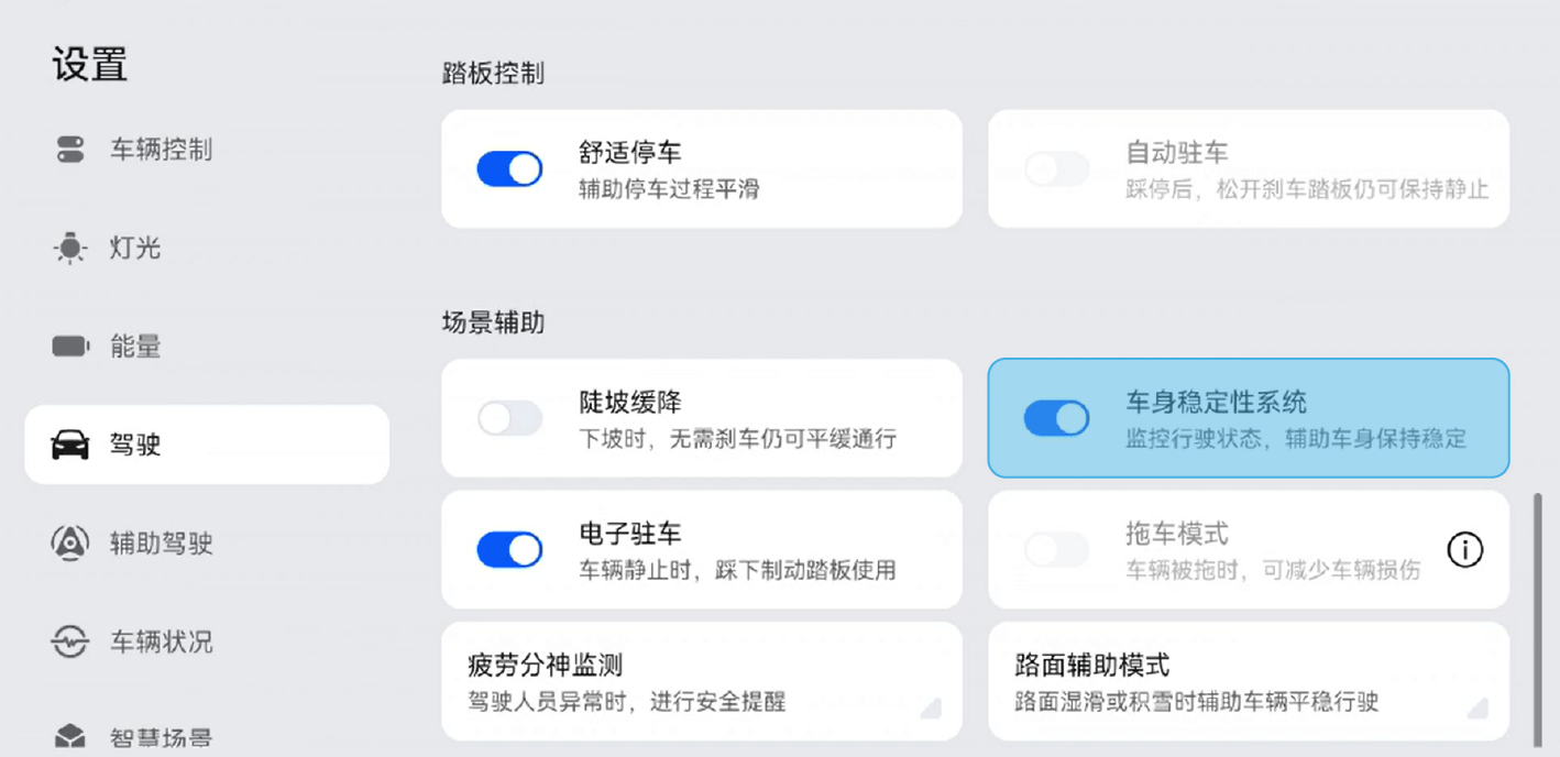 在中控屏进入“设置>驾驶”,开启或关闭车身稳定系统。
