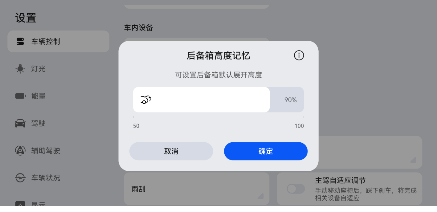 在中控屏进入“设置>车辆控制”,点击“后备箱高度记忆”,可将后备箱默认展开高度设置为50%~100%开度。