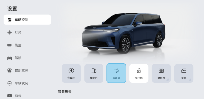 在中控屏进入“设置>车辆控制”,点击“后备箱”,可打开、暂停或关闭后备箱。