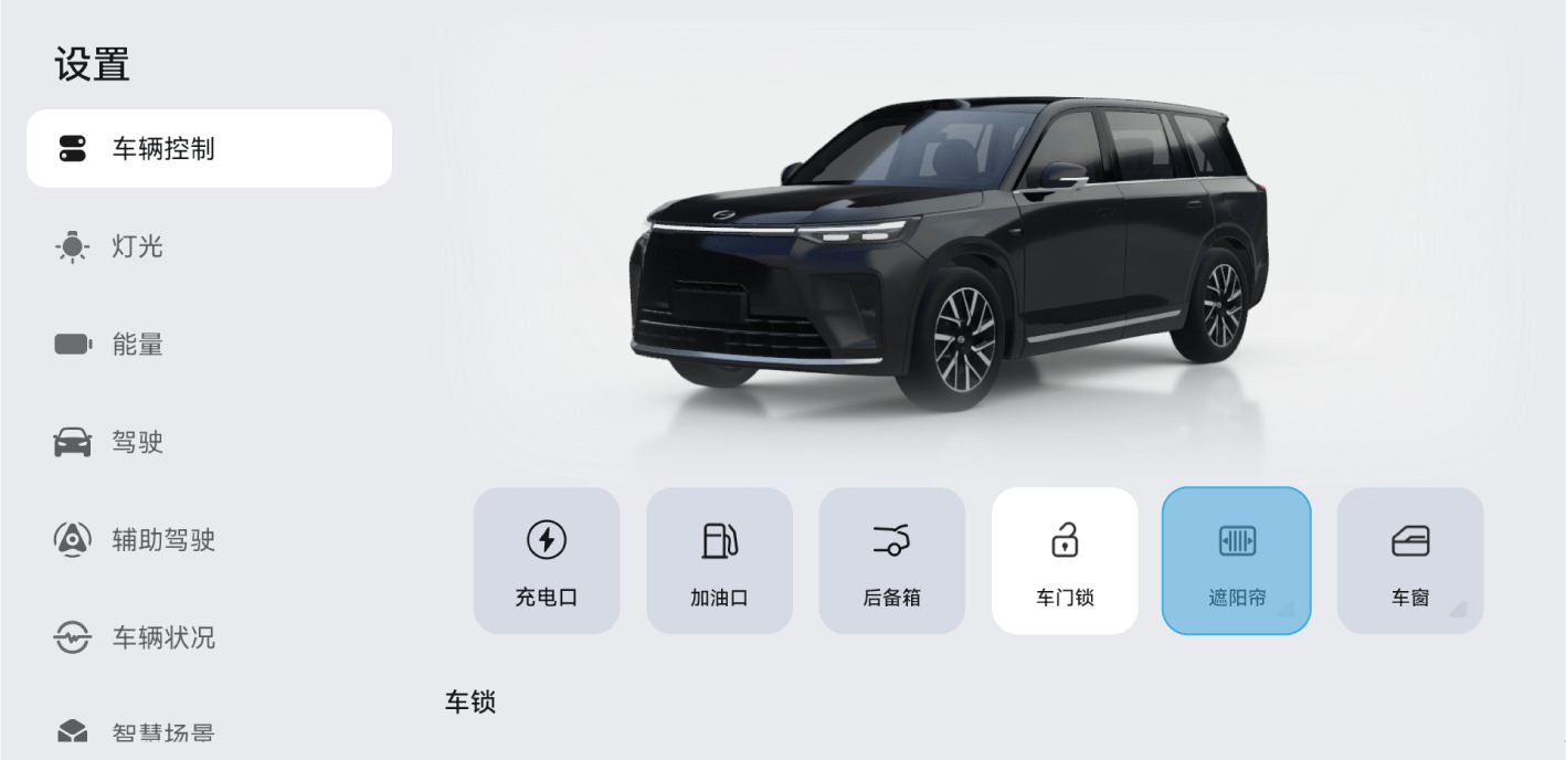 在中控屏进入“设置>车辆控制”,点击遮阳帘,展开遮阳帘调节选项(前遮阳帘或后遮阳帘)。