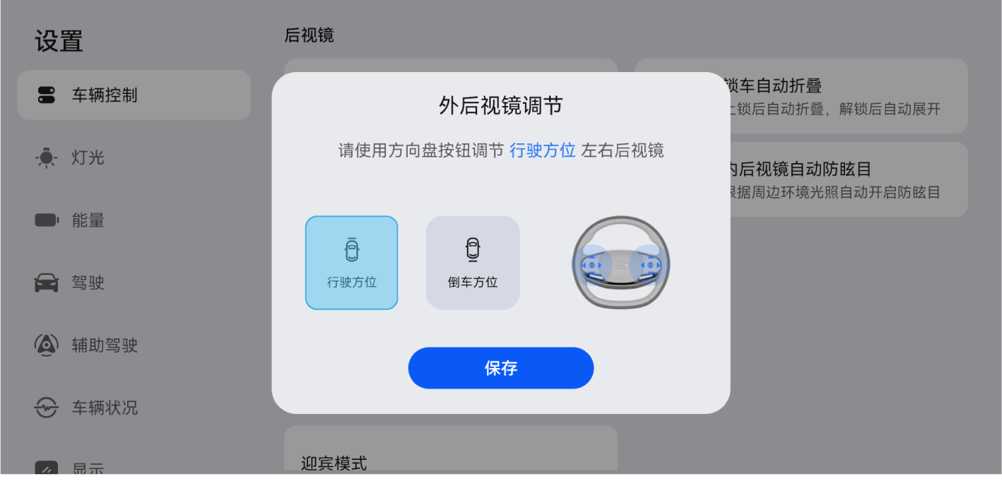 在中控屏进入“设置>车辆控制>后视镜调节”选择行驶方位。