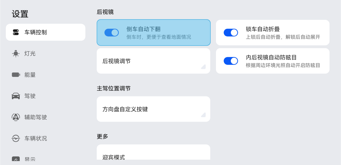 在中控屏进入“设置>车辆控制”,开启或关闭倒车自动下翻。