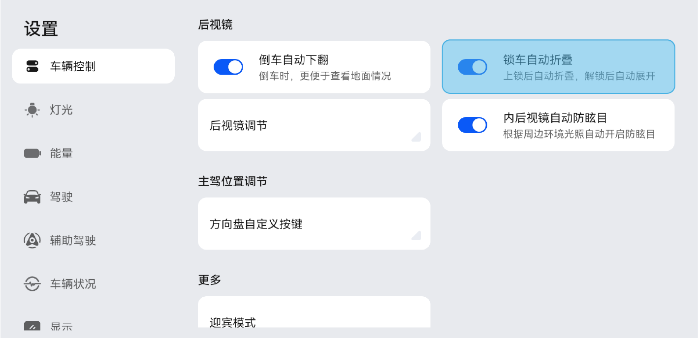 在中控屏进入“设置>车辆控制”,开启或关闭锁车自动折叠。