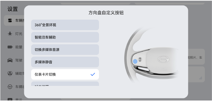 在中控屏进入“设置>车辆控制>方向盘自定义按键”,可设置短按或长按需要定义的功能,如:360全景环视、智能泊车辅助、切换多媒体音源、多媒体静音、仪表卡片切换等。