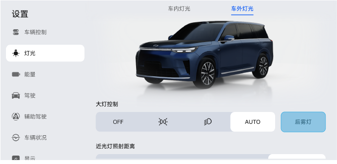 在中控屏进入“设置>灯光”,点击“后雾灯”,可开启或关闭后雾灯,仪表显示屏上的后雾灯指示灯会相应点亮或熄灭。
