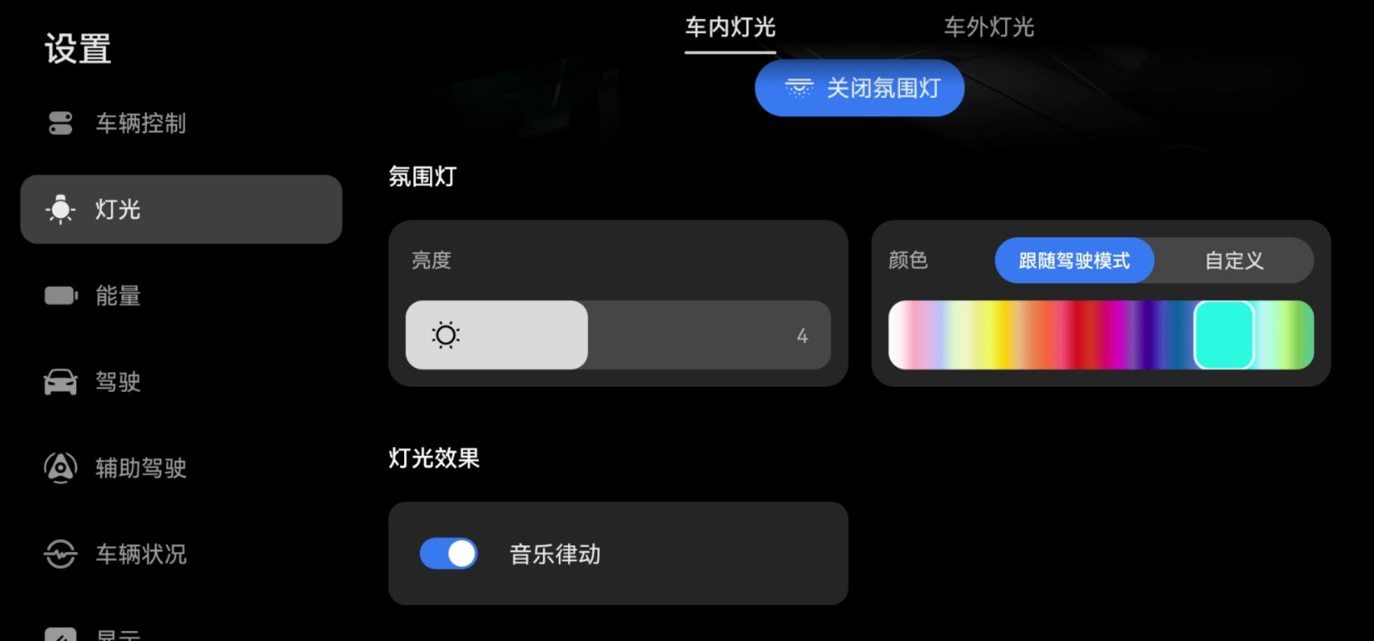 开启后,氛围灯亮度与颜色随音乐自动变换。