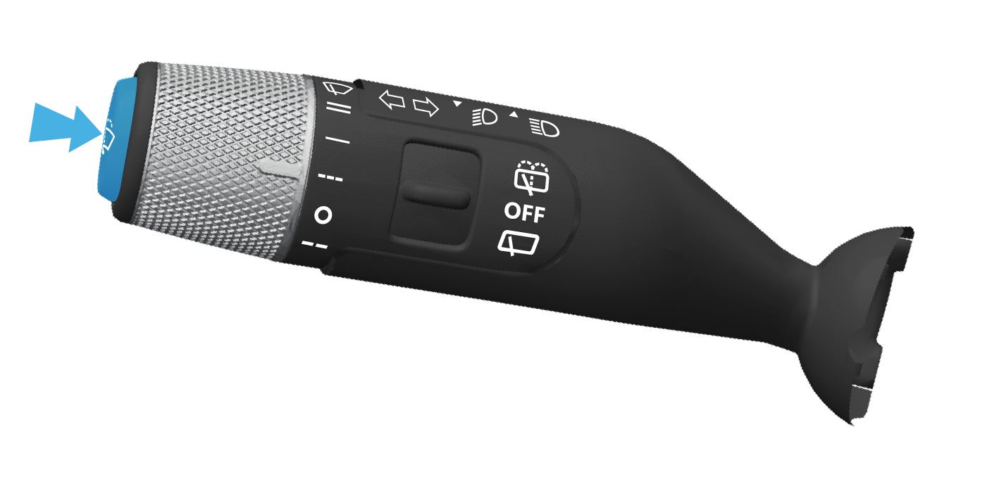 短按控制拨杆端部开关:前风挡雨刮往复刮刷一次。