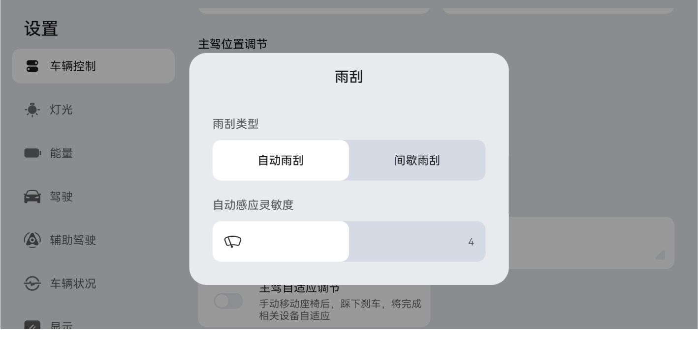 自动雨刮:当选择为自动雨刮时,可设置自动感应灵敏度。