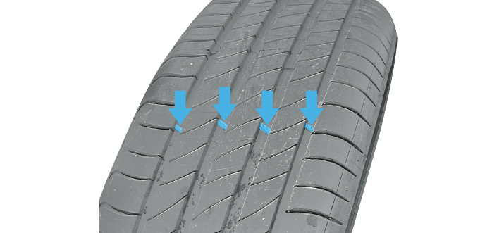 胎面磨损标识是一条穿过轮胎胎面花纹纵向凹槽的狭长标高线。在轮胎上有胎面磨损标识的图标。胎面与胎面磨损标识的高度相同时,请尽快更换新轮胎。