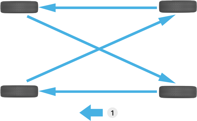 为了提高胎面的使用寿命,保持牵引力水平和稳定、静谧的驾驶性,需要定期进行轮胎换位。轮胎换位周期根据驾驶员的驾驶习惯和路面状况而有所不同,建议车辆每行驶10000km进行一次轮胎换位。