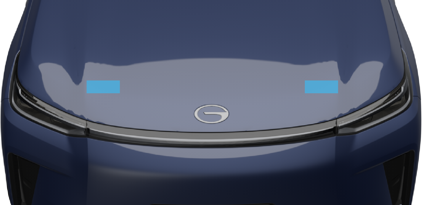 将前机舱盖放低后,稍微用力向下按压前机舱盖图示区域使其关闭牢固锁定。