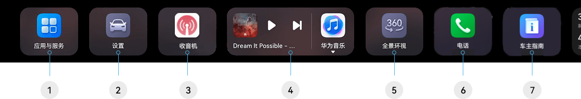 您可以从中控屏底部向上滑出快捷栏,快速直达常用的应用。