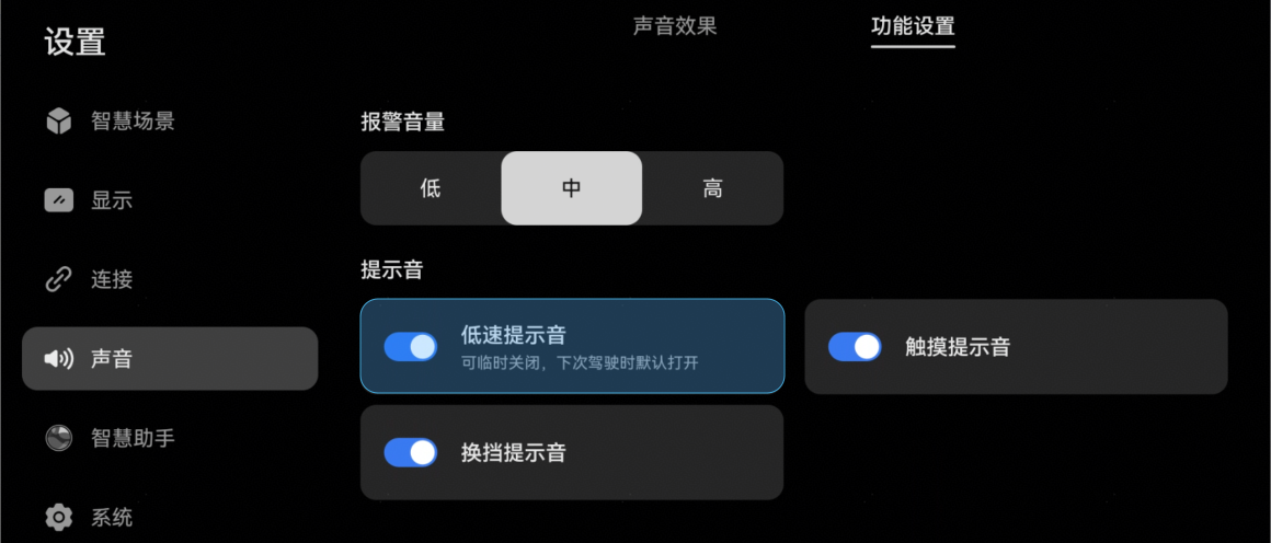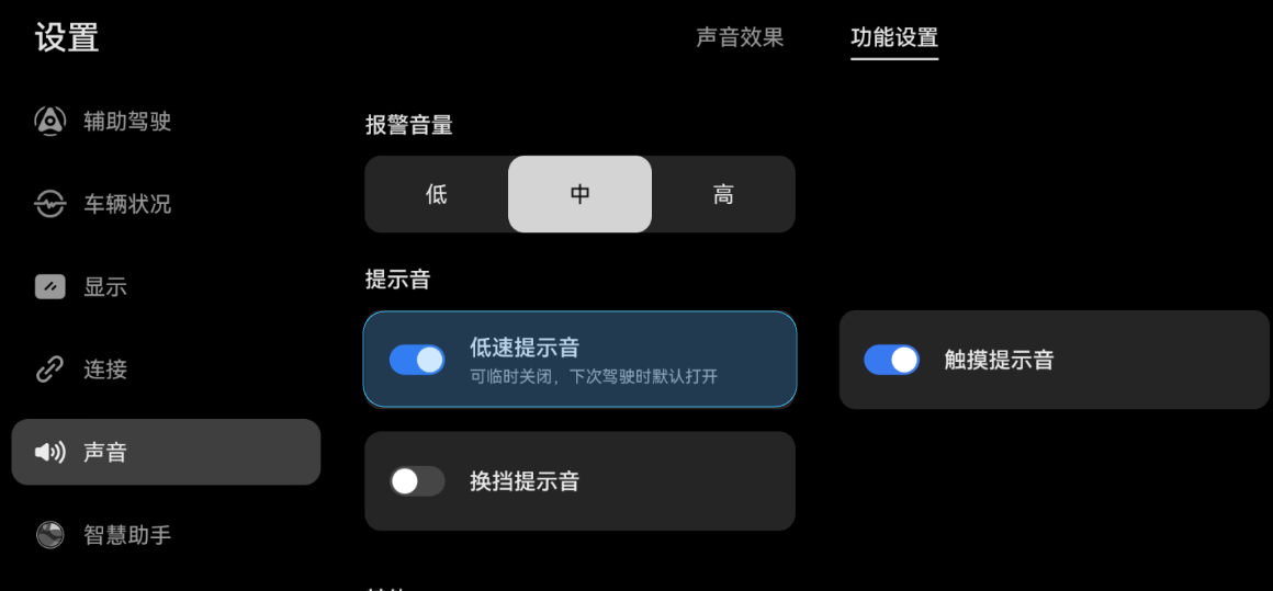 在中控屏进入“设置 > 声音 > 功能设置 > 低速提示音”,点触按钮可临时关闭低速提示音。