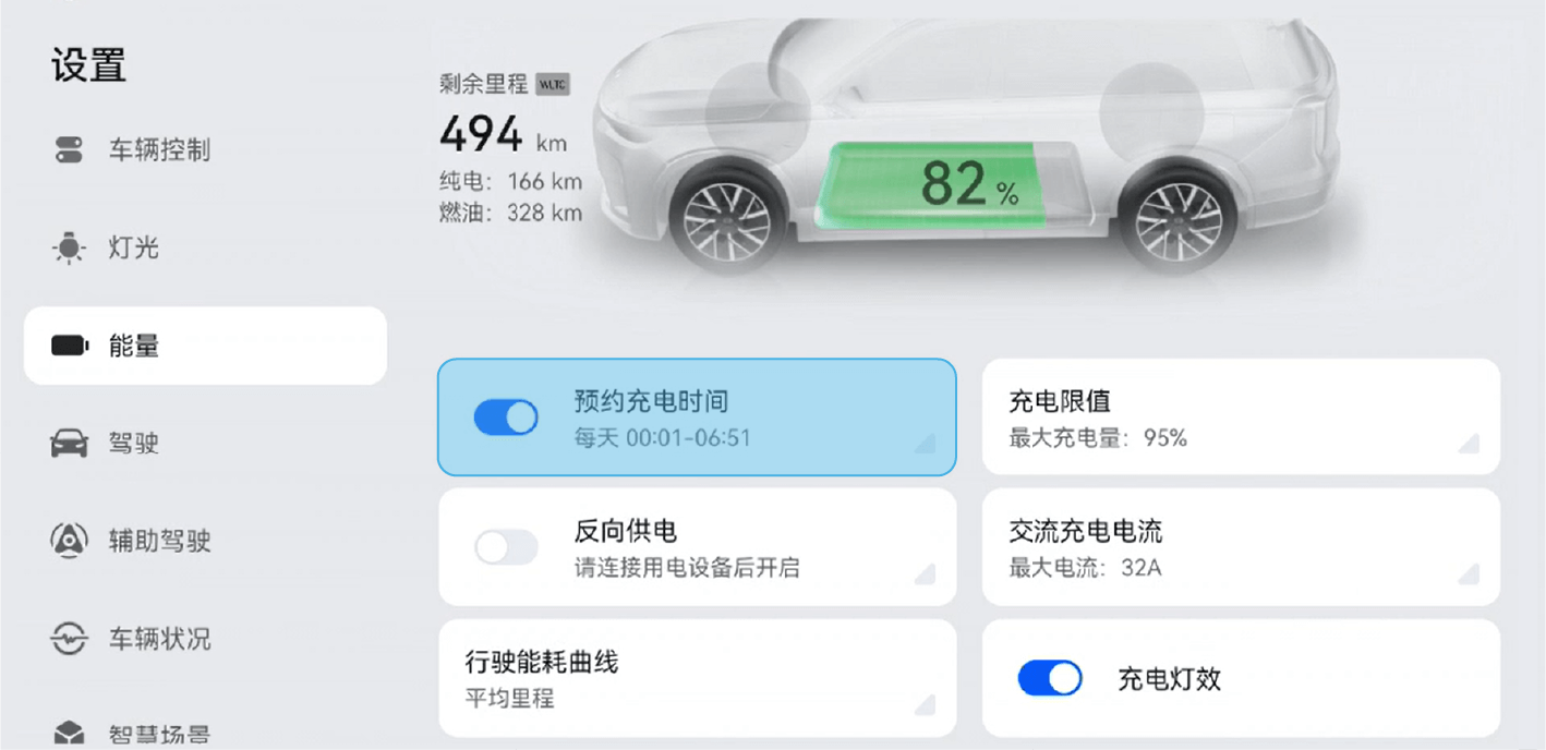 在中控屏进入“设置>能量>预约充电”中设置充电时长。