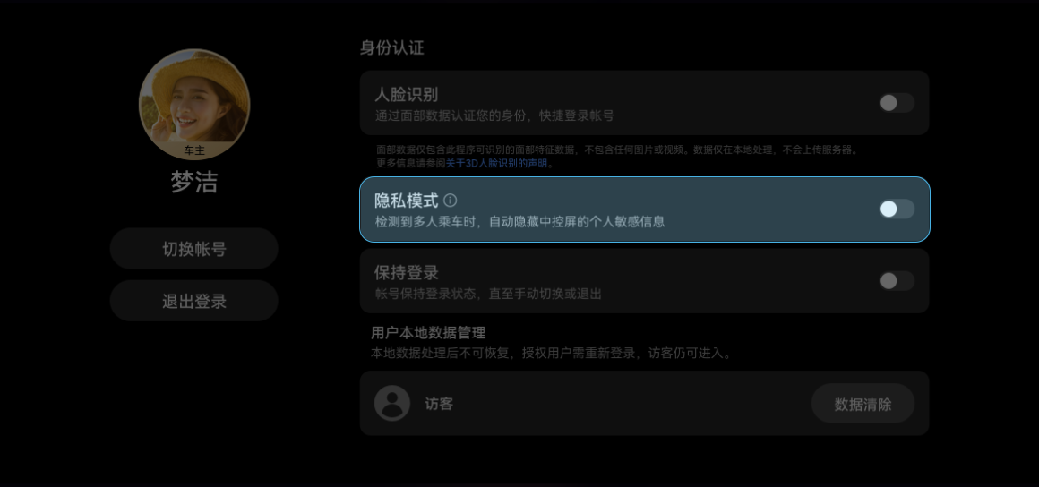 副驾或第二排座椅感应到有人乘坐时,系统自动进入隐私模式;副驾与第二排乘客全部下车时,隐私模式自动退出。