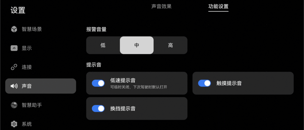 您可以开启或关闭“低速提示音”、“触摸提示音”及“换挡提示音”。 |