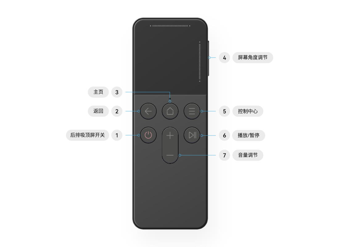 车载遥控器与吸顶屏配合使用,车载遥控器与车辆蓝牙连接成功后,后排乘客可以通过车载遥控器便捷地控制吸顶屏。车载遥控器通过商城购买,有不同形式遥控器,如下仅针对一种遥控器外观进行介绍,其他可参考类似设置。