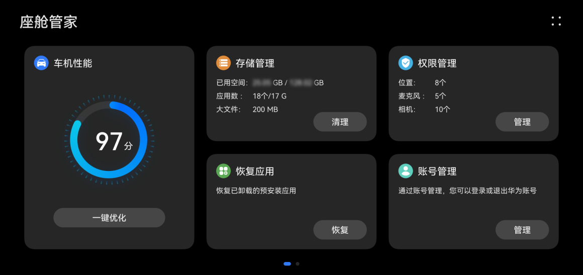 通过座舱管家,您可以一键优化车机性能、清理应用缓存文件或管理应用的敏感权限(如位置信息、电话),便捷地管理中控屏上的应用。