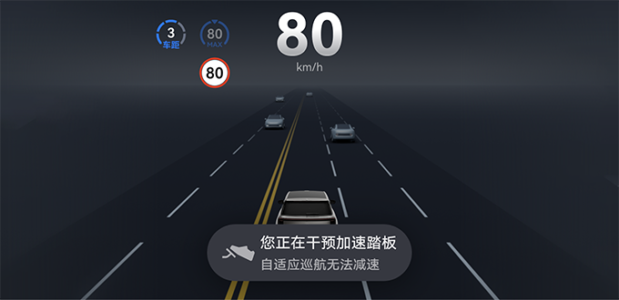 干预加速踏板时,可以根据加速到的实时车速、结合向上慢滚一次方向盘右滚轮等操作来调节目标车速,请参阅调节目标车速。