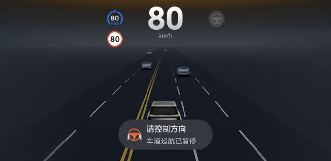 在部分场景下,系统会在仪表屏显示“请小心驾驶”弹窗的同时辅助驾驶员控制车辆减速停车,车辆会在减速至规定差值或刹停时点亮危险报警灯。