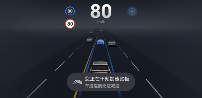 干预加速踏板期间,驾驶员应特别注意仪表屏上显示的蓝色高亮车道线(即自车规划的行驶路线),若其与预期不符,请立即控制车辆行驶方向,主动接管。