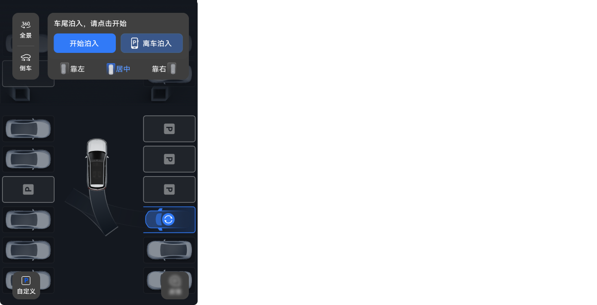 踩住制动踏板的同时,点触“开始泊入”。驾驶员也可根据系统提示选择“靠左”或“靠右”泊入,此方式仅支持车尾朝里泊入,且仅适用于垂直、斜列和空间车位,不适用于平行车位和自定义车位。