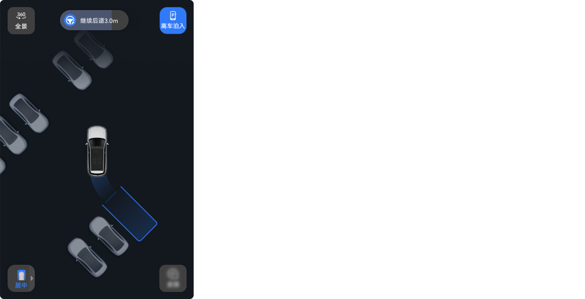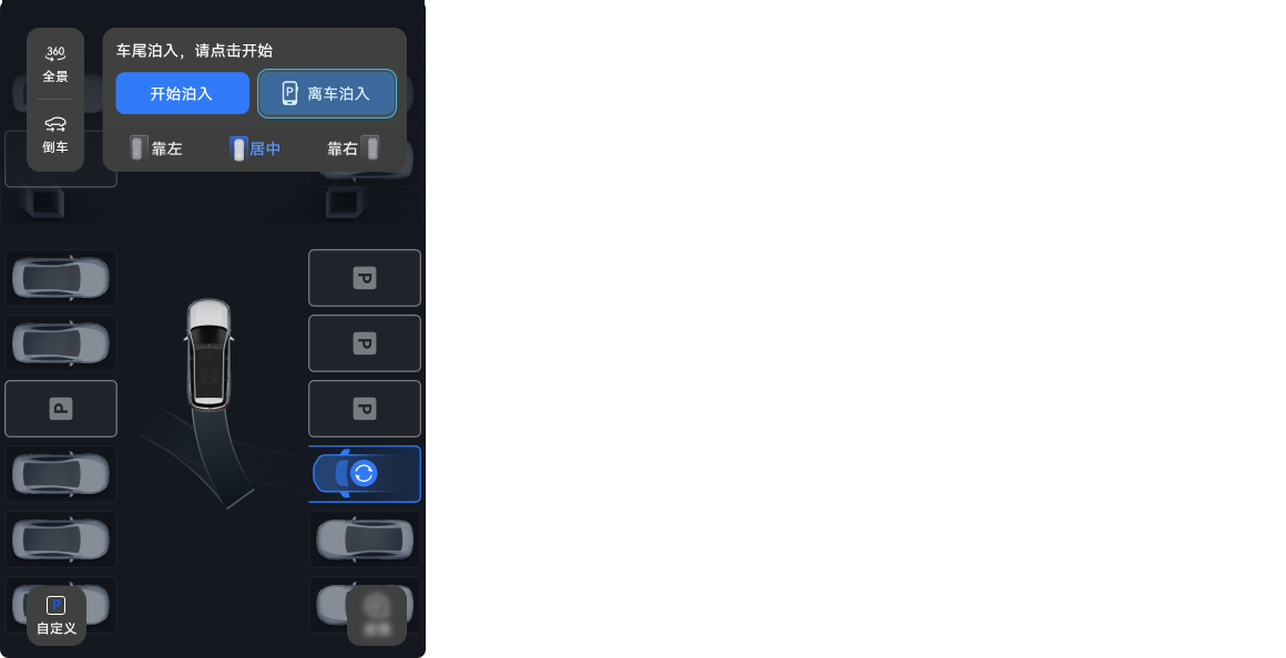 驾驶员也可根据系统提示选择“靠左”或“靠右”泊入,此方式仅支持车尾朝里泊入,且仅适用于垂直、斜列和空间车位,不适用于平行车位和自定义车位。