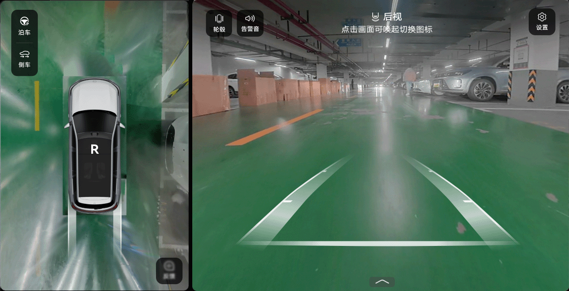 挂 R 挡(请确认中控屏的“设置 > 辅助驾驶 > 全景环视”已设置了挂 R 挡默认打开 “360° 全景环视”)。
